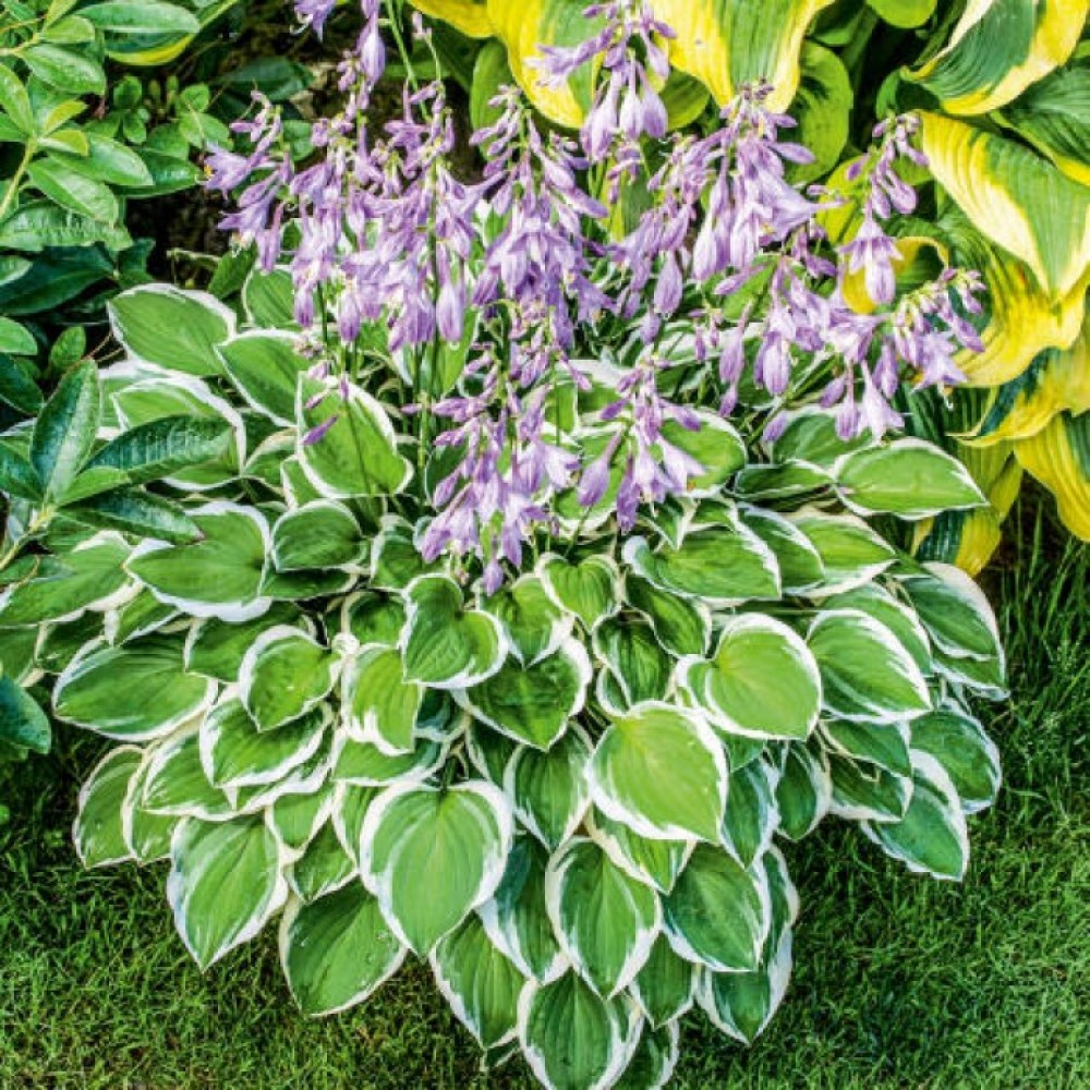 Хоста гибридная Даймонд Тиара - многолетнее, декоративно-лиственное растение. Размер куста 35х60 см. Листья округлые, зеленые с неровной кремово-белой каймой, цветы темно-лавандовые. Для посадки выбирают полутенистые или тенистые места, предпочитает влажные почвы. Полив тщательный и регулярный, при хорошем поливе у хосты будут крупные, здоровые листья и пышное цветение. Хоста гибридная Даймонд Тиара прекрасно зимует. На одном месте может расти более 20 лет. Эффектно смотрятся у водоёмов.